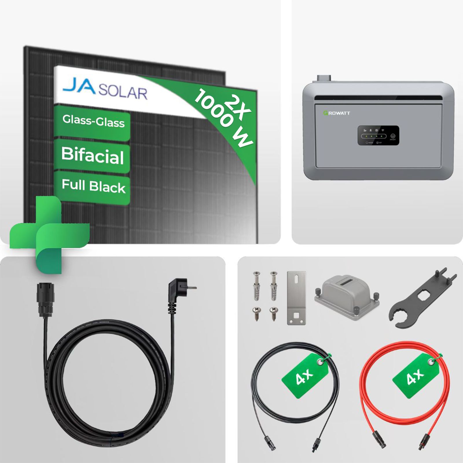 1000wp Balkonkraftwerk SET | JA Solar 500W Glas-Glas Bifacial Full Black | Growatt NEXA 2000 Speicher | All-in-One