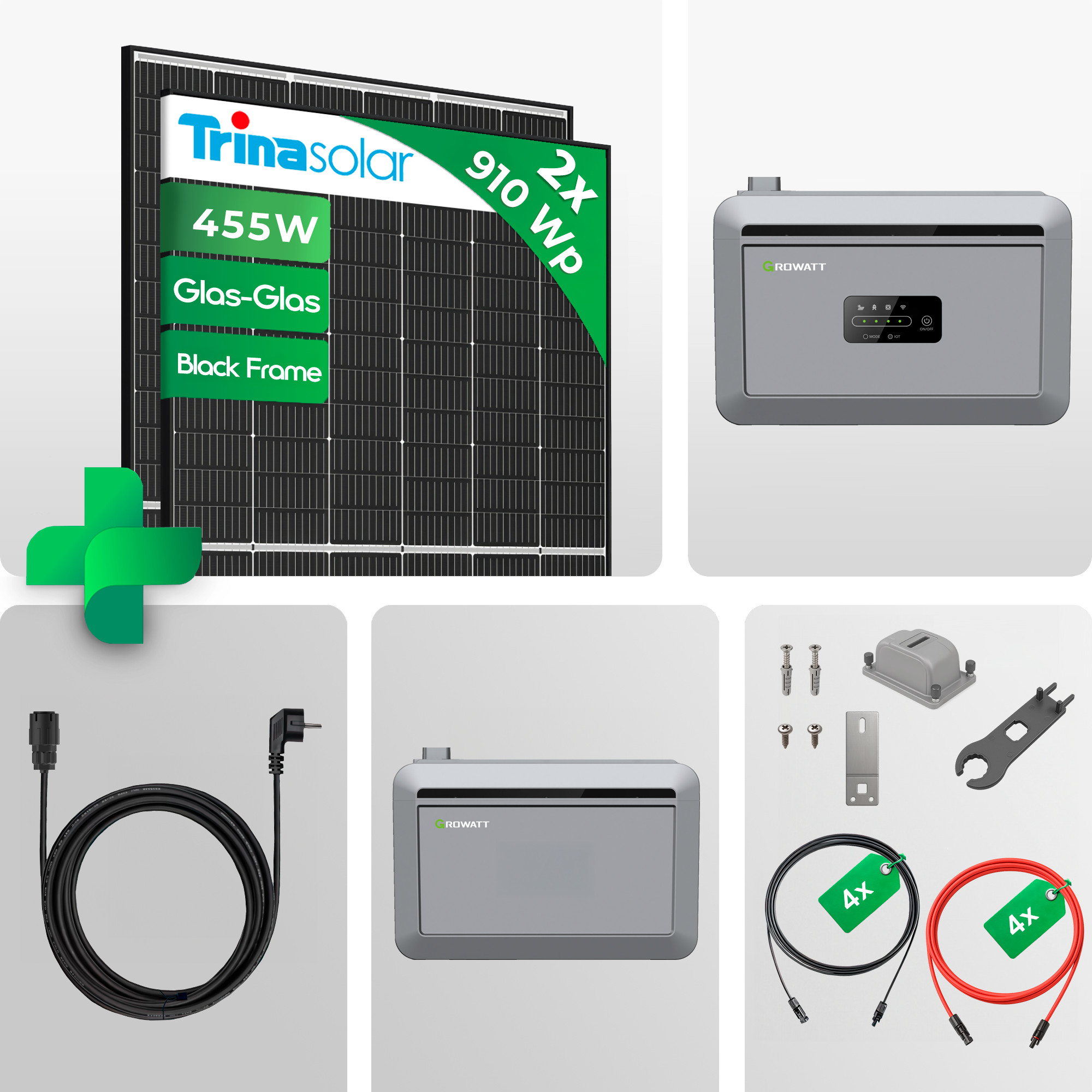 910wp Balkonkraftwerk SET | Trina Vertex S+ 455W Glas-Glas | Growatt NEXA 2000 Speicher | All-in-One