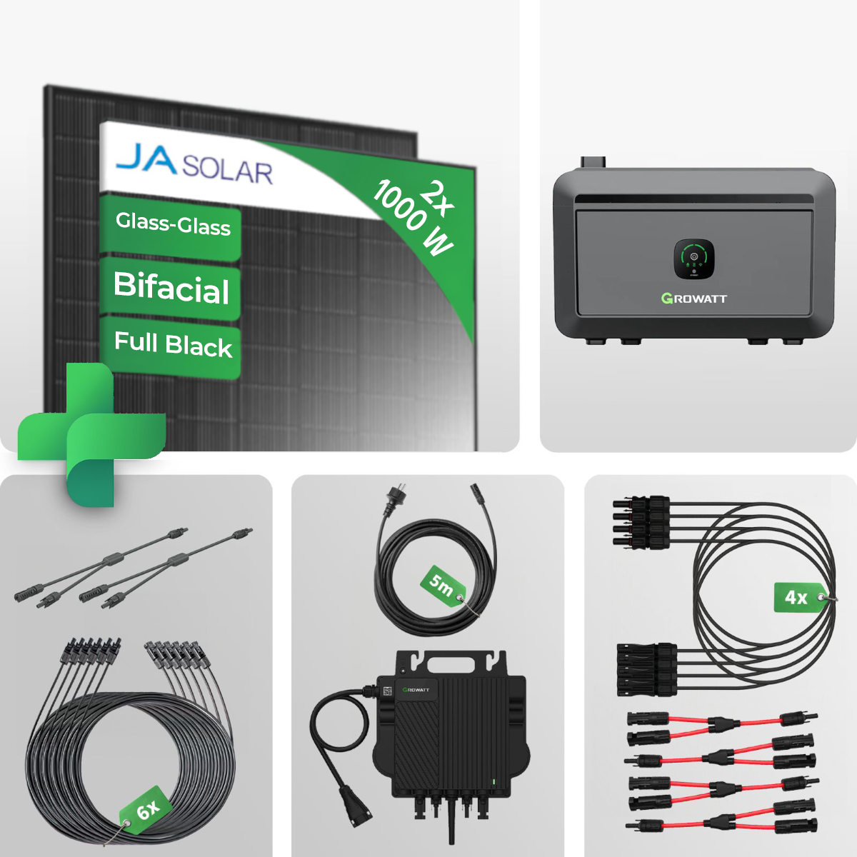 1000wp Balkonkraftwerk SET | JA Solar 500W Glas-Glas Bifacial Full Black | + 2kWh Speicher | 600/800 Watt Mikrowechselrichter