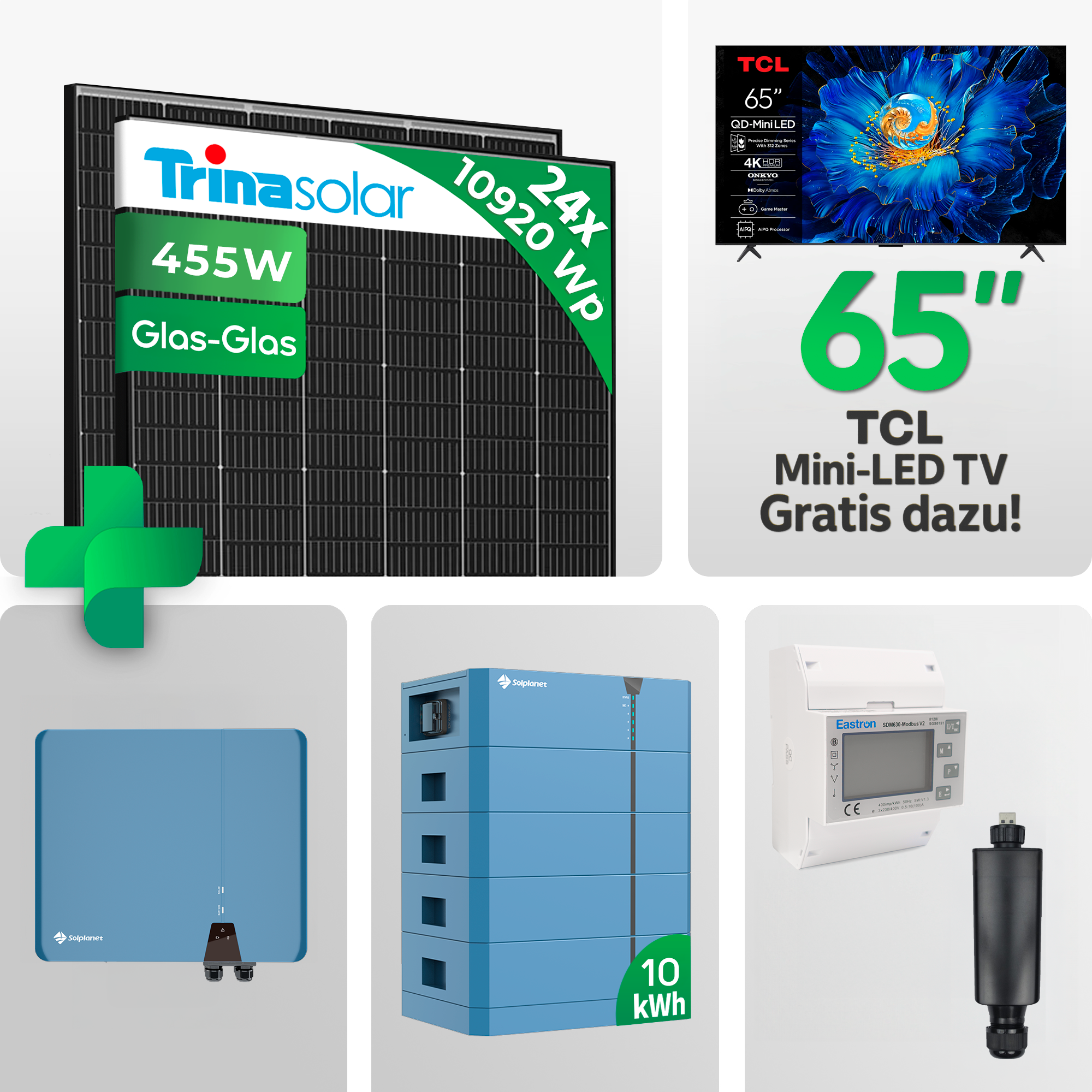 10,92 kWp PV-Komplettanlage mit 10 kWh Speicher und 455W Trina Vertex S+ Solarmodulen – inkl. kostenlosem TCL 65 Zoll Smart TV*