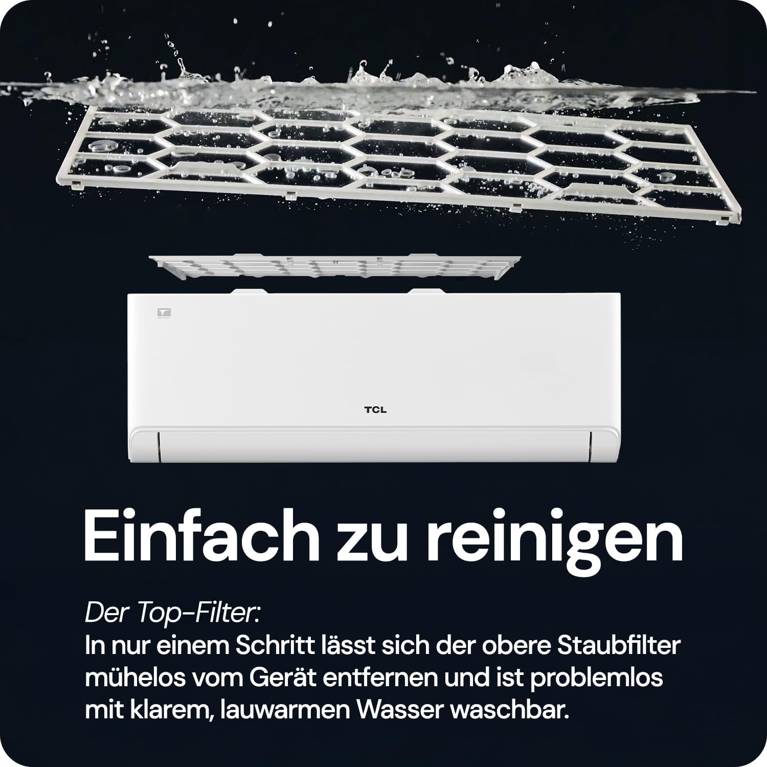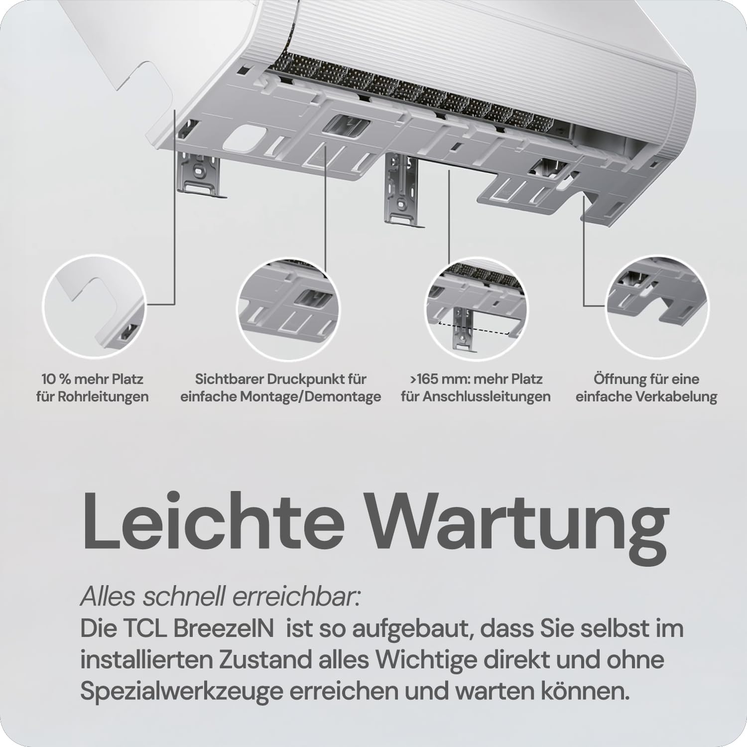 Die TCL BreezeIN Split Klimaanlage wurde so konzipiert, dass alle wichtigen Komponenten leicht zugänglich und einfach zu reinigen sind. Dank des cleveren Designs lassen sich Filter, Lamellen, Abdeckung und weitere Bauteile ohne Werkzeug abnehmen, säubern und wieder einsetzen.
