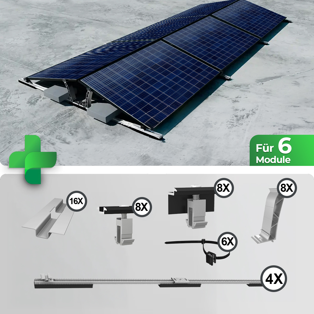 Dieses Montageset ist als Komplettpaket für die Montage von 6 gerahmten Photovoltaikmodulen ausgelegt. Es eignet sich ideal für größere Flachdachflächen, bei denen eine effiziente und saubere Ost-West-Belegung realisiert werden soll.